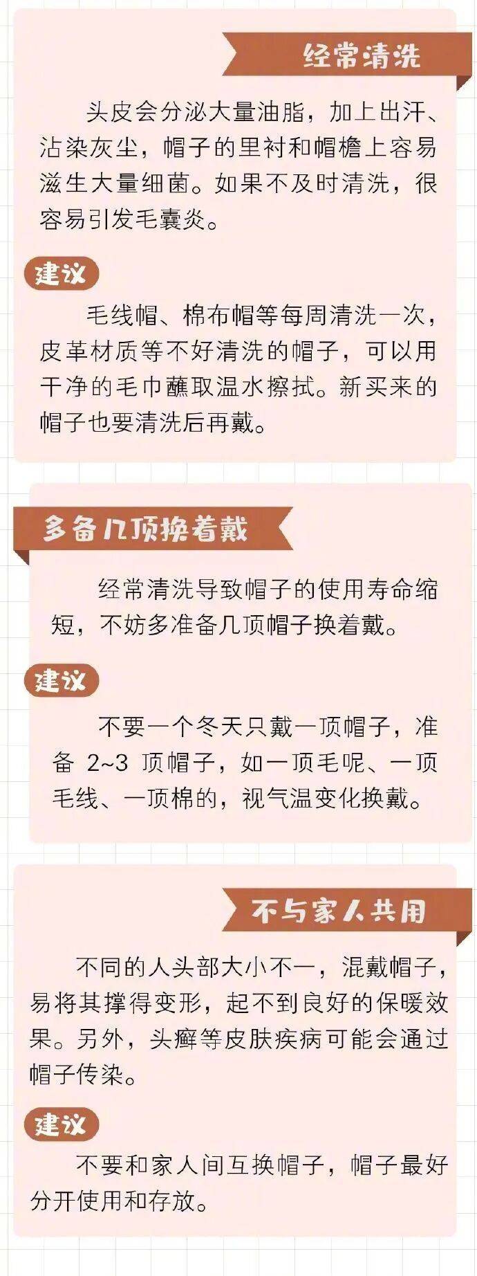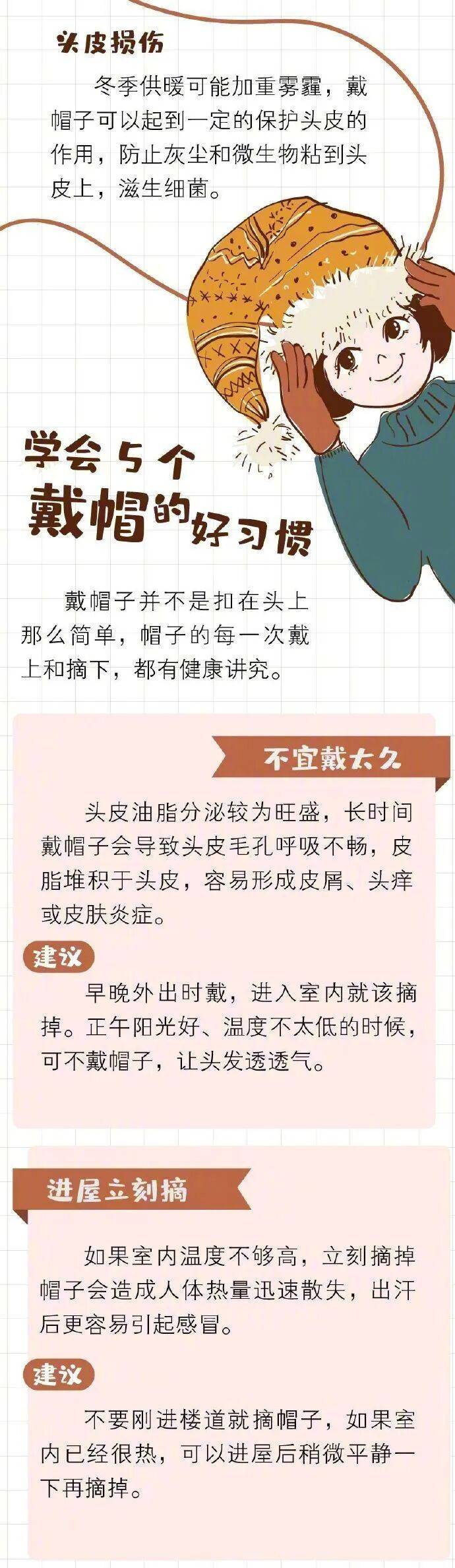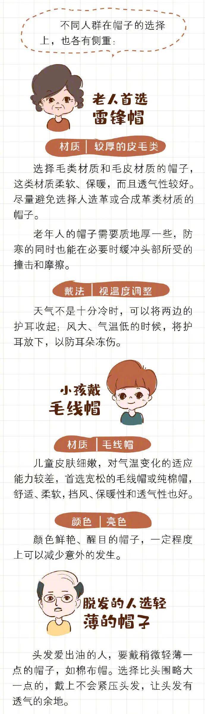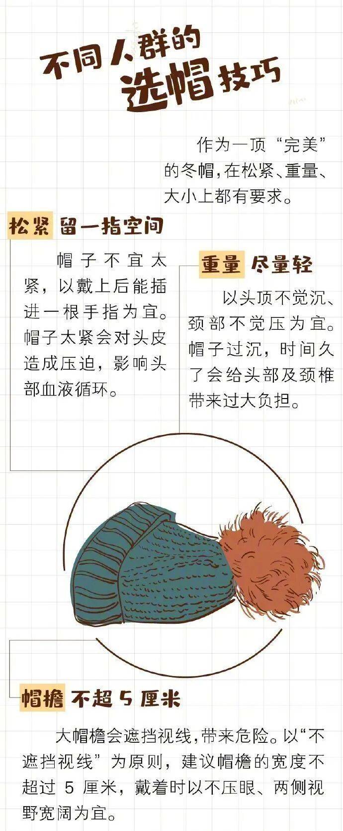 为了防寒,人们外出时总会穿上厚厚的冬装,但很多人却没有戴帽子的习惯。实际上,头部血管、神经密集,是人体散发热量最大的部位之一,做好头部保暖非常关键。有研究表明,静止状态下不戴帽子,气温15℃时,人体约1/3的热量会从头部散发;而气温在4℃左右时,约一半的热量从头部跑掉。